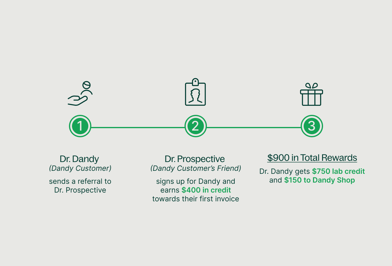 - If the referred practice completes our introductory training, you will receive a $750 bonus that can either be redeemed for lab credit on your monthly invoice, or Dandy Shop credit for scanner accessories and more!